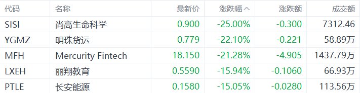 中概股收盘跌幅居前的个股为:尚高生命科学跌25%,明珠货运跌22.1%,Mercurity Fintech跌21.28%,丽翔教育跌15.94%,长安能源跌15.05%。(格隆汇)