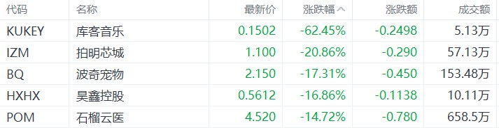 中概股收盘跌幅居前的个股为:库客音乐跌62.49%,拍明芯城跌20.86%,波奇宠物跌17.31%,昊鑫控股跌16.86%,石榴云医跌14.72%。(格隆汇)
