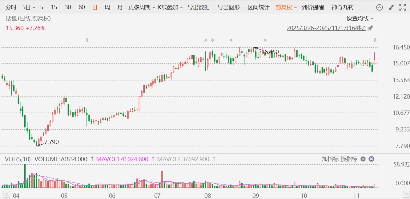 搜狐(SOHU.US)周一收涨7.26%,报15.36美元。消息面上,公司公布财报显示,2025年三季度总收入1.8亿美元,同比增长19%,环比增长43%;归于公司的非美国通用会计准则净利润900万美元,同比扭亏为盈。从业务来看,营销服务收入为1400万美元;在线游戏收入为1.62亿美元。此外,根据搜狐公司此前宣布的总金额最高1.5亿美元的美国存托股票回购计划,截至2025年11月13日,搜狐已经回购了760万股搜狐美国存托股票,总金额约9700万美元。