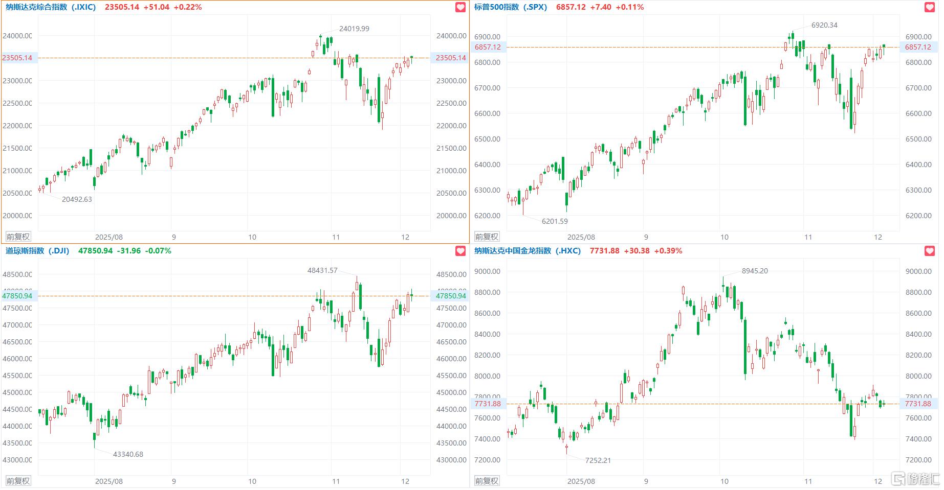 美国上周首次申领失业救济人数降至3年低位,降息预期稍降温;美股三大指数收盘涨跌不一,道指跌0.07%,纳指涨0.22%,标普500指数涨0.11%,热门科技股涨跌不一,Meta涨超3%,英伟达涨超2%,亚马逊、苹果跌超1%。计算机硬件、加密矿企涨幅居前,SanDisk涨超9%,Hut8涨近7%,戴尔科技涨超4%,惠普涨近3%。贵金属、旅游酒店、锂矿概念股跌幅居前,美国雅保跌超5%,希尔顿酒店、皇家加勒比邮轮跌超2%。