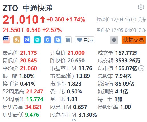昨日收涨1.74%的中通快递(ZTO.US)今日美股盘前续涨2.57%,报21.55美元。消息面上,国泰海通证券研报指出,中通快递Q3盈利增速改善主要受益于8月以来反内卷监管下行业价格水平回升和公司业务结构优化,散件业务量同增50%,持续贡献利润量增。该机构预计公司Q4业务量维持8%左右平稳增长,净利润增速持续改善。中泰证券亦指,公司是国内加盟制快递龙头,在资产布局、市场份额等方面具备领先优势,并持续提升核心竞争力,竞争格局改善趋势下有望实现强者更强。(格隆汇)