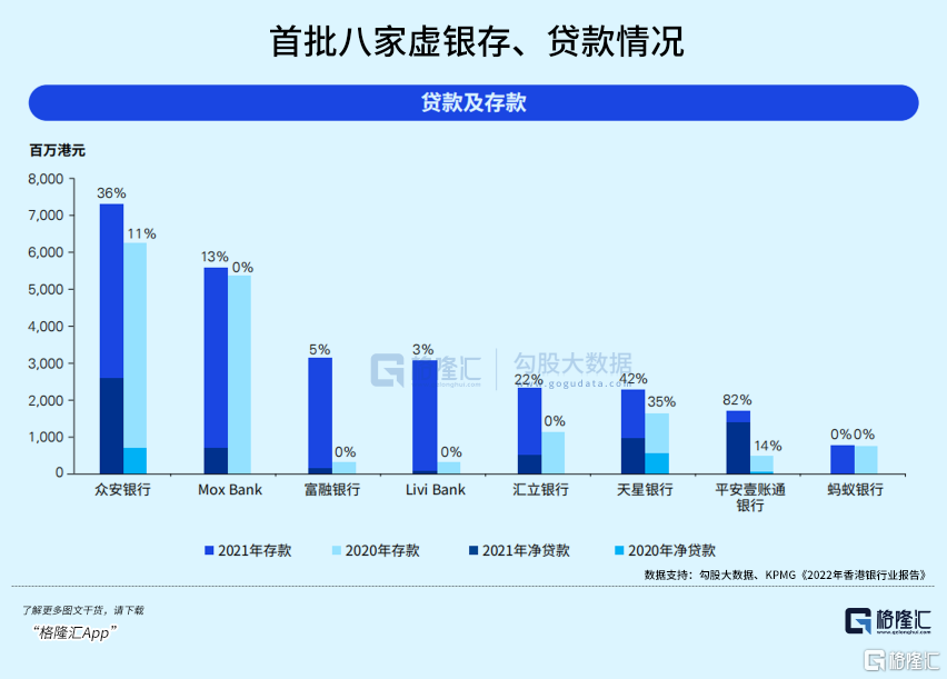 就盈利模式而言,目前这八家主要收入来自于贷款,与国内传统银行相似。根据KPMG发布的《2022年香港银行业报告》显示,2021年众安以绝对的存/贷款规模处于首位,且增长显著;平安壹账通虽体量小,但增长最快。