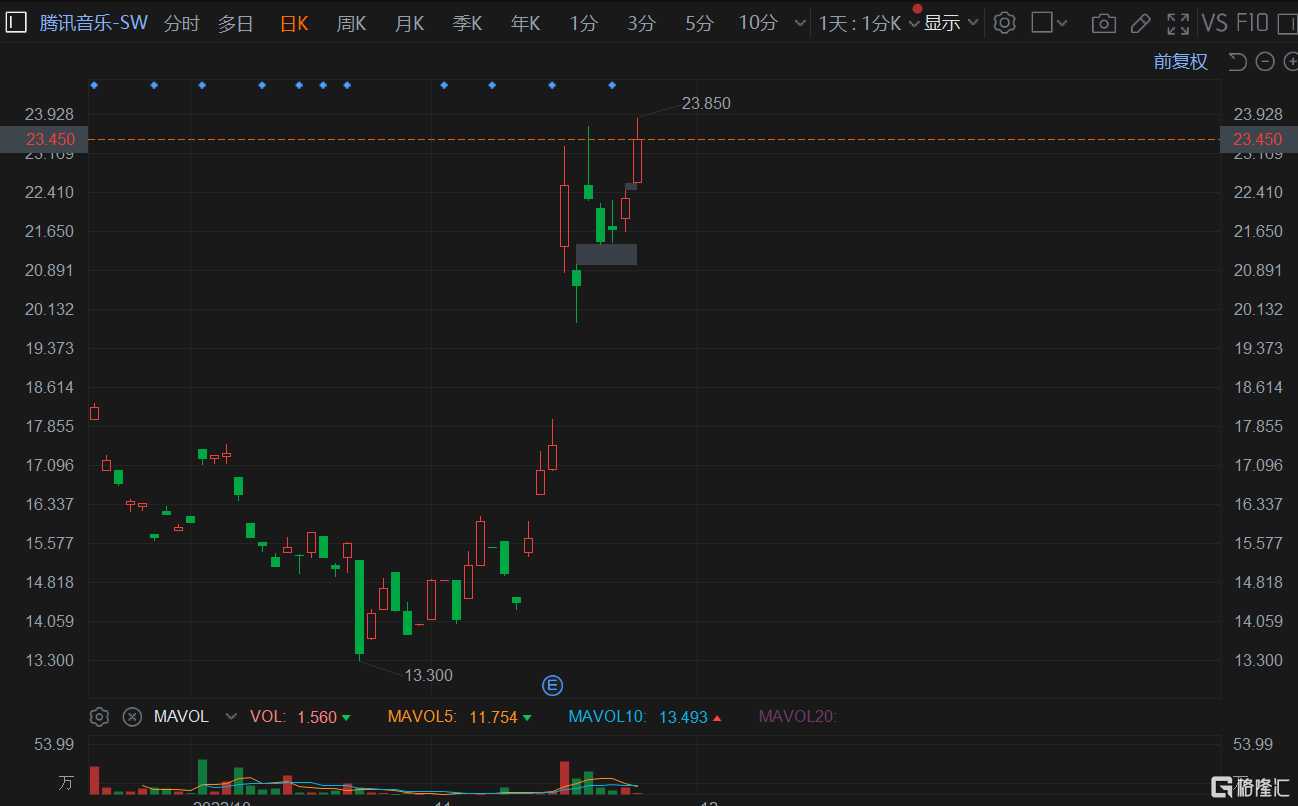 格隆汇11月24日丨腾讯音乐-SW(1698.HK)涨超5%,盘中最高报23.85港元续刷上市新高价,总市值近800亿港元。公司日前公布的Q3业绩超预期,安信证券认为广告收入在Q4有望延续Q3的增长势头。未来其商业化潜力有待进一步释放,同时在降本增效驱动下利润端有望继续录得良好表现。据悉,公司正积极探索音频直播、国际化扩张以及虚拟音乐活动以探寻新动能。