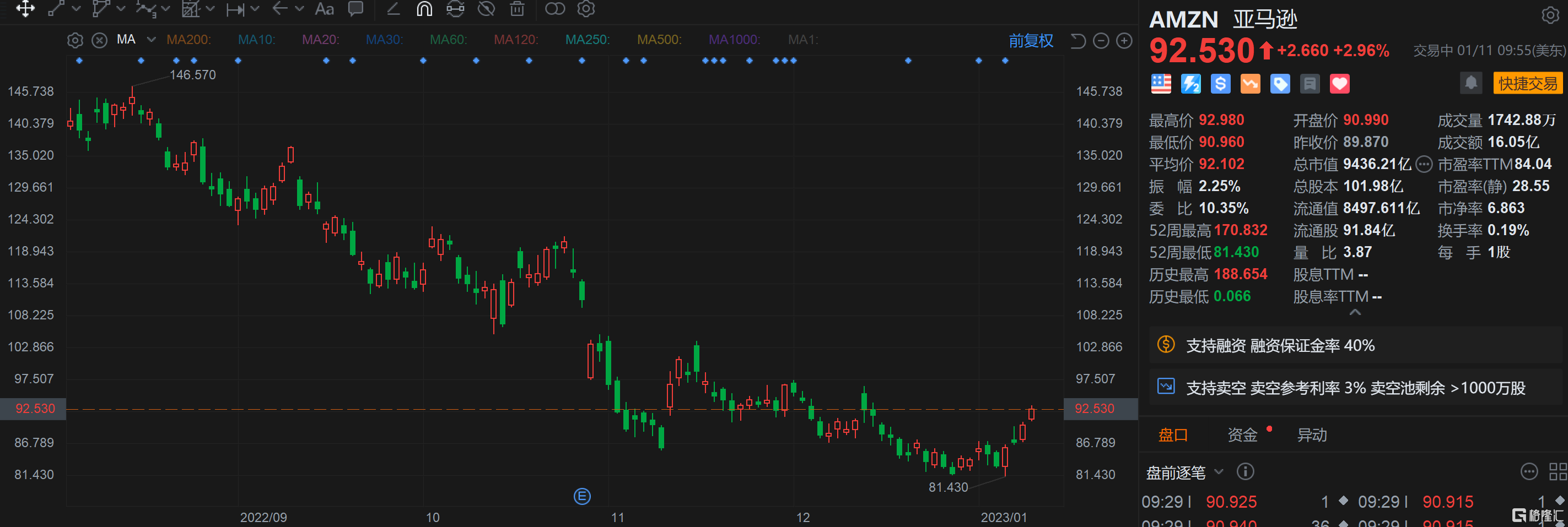 格隆汇1月11日丨亚马逊(AMZN.US)在昨日上涨2.87%后,今日再涨3%,报92.53美元。亚马逊将在1月31日前向美国的商家开放Buy with Prime服务,该服务允许其平台以外的在线商家使用亚马逊的支付和物流服务。此前,该服务只有受到邀请的商家才能使用。