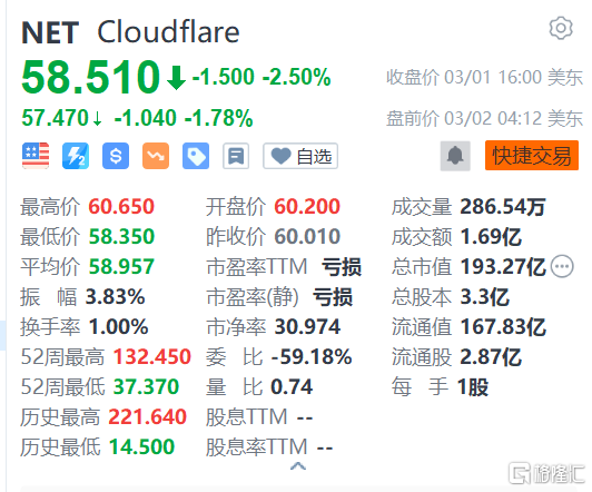 格隆汇3月2日丨Cloudflare盘前跌约2%,报57.47美元。据美国证券交易委员会(SEC)2月28日披露的文件,Cloudflare首席财务官SEIFERT THOMAS J于2月27日以每股平均价60.2511美元售出2万股普通股股份,价值约为120.5万美元。