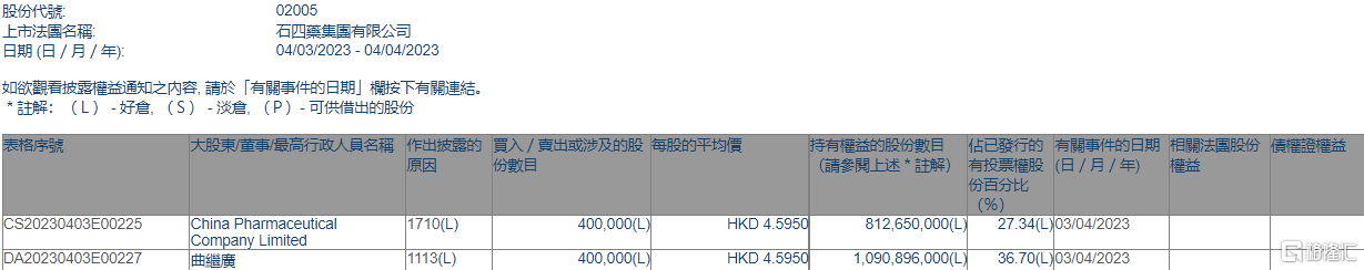 格隆汇4月4日丨根据联交所最新权益披露资料显示,2023年4月3日,石四药集团(02005.HK)获执行董事曲继广在场内以每股均价4.595港元增持40万股,涉资约183.8万港元。