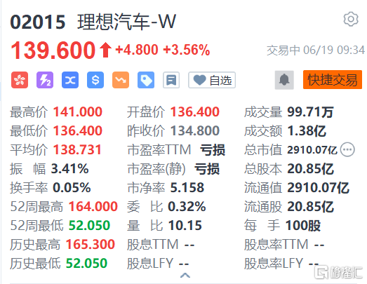理想汽车(02015.HK)涨超3.5%,报139.6港元,三个月已累涨超57%。理想汽车发布公告,于2023年6月17日(美国东部时间),该公司举办了家庭科技日活动,介绍了公司在电动化和智能化方面的进展和规划。在高压纯电方面,理想汽车对高压纯电车型的电池和电池热管理系统进行了优化,更加充分地利用了电池的最大5C充电倍率,可实现峰值500kW以上的充电功率。此外,公司也已经开始自建5C超级充电网络。在智能化上,公司公布了智能空间和智能驾驶的进展和规划,并计划于6月在北京和上海开启城市NOA的早鸟用户测试,于今年下半年向早鸟用户开放通勤NOA。