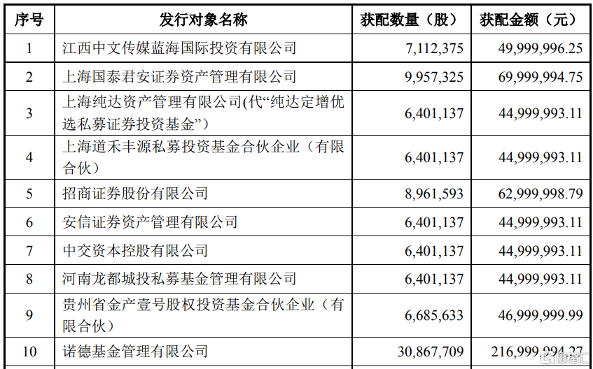 格隆汇6月19日丨天能重工(300569.SZ)公布向特定对象发行股票发行情况报告书,发行人和联席主承销商确定本次发行股票的发行价格为7.03元/股,发行数量为2.13亿股,募集资金总额约为15.0亿元。发行对象及其获配股数、获配金额的具体情况如下: