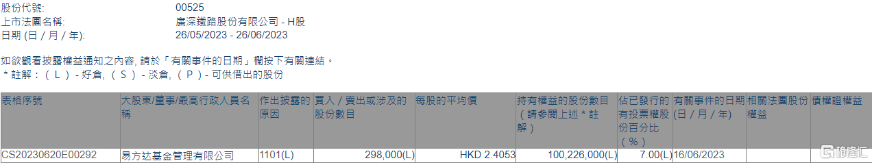 格隆汇6月26日丨根据联交所最新权益披露资料显示,2023年6月16日,广深铁路股份(00525.HK)获易方达基金管理有限公司在场内以每股均价2.4053港元增持29.8万股,涉资约71.68万港元。