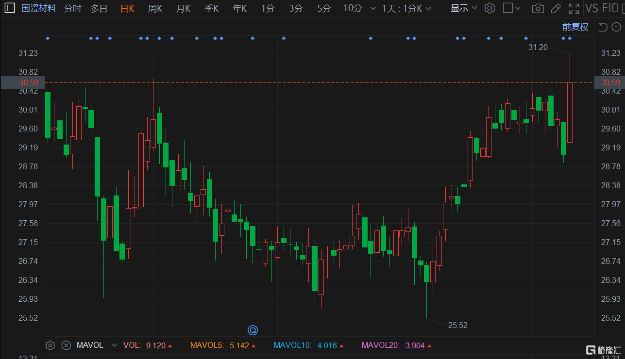 格隆汇8月9日丨国瓷材料(300285.SZ)一度涨超7%,最高报31.2元创阶段高价,成交额放大至2.79亿元,总市值超300亿元。国泰君安研报指出,公司Q2业绩环比增长,“内生式发展+外延式并购”实现材料、技术、渠道多领域协同,未来业绩有望超预期增长。
