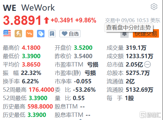 Wework(WE.US)盘中一度涨18%,截至发稿,涨近10%,报3.8891美元。此前公司宣布将重新谈判几乎所有的(办公室)租约,并预计日常经营不会发生变化。