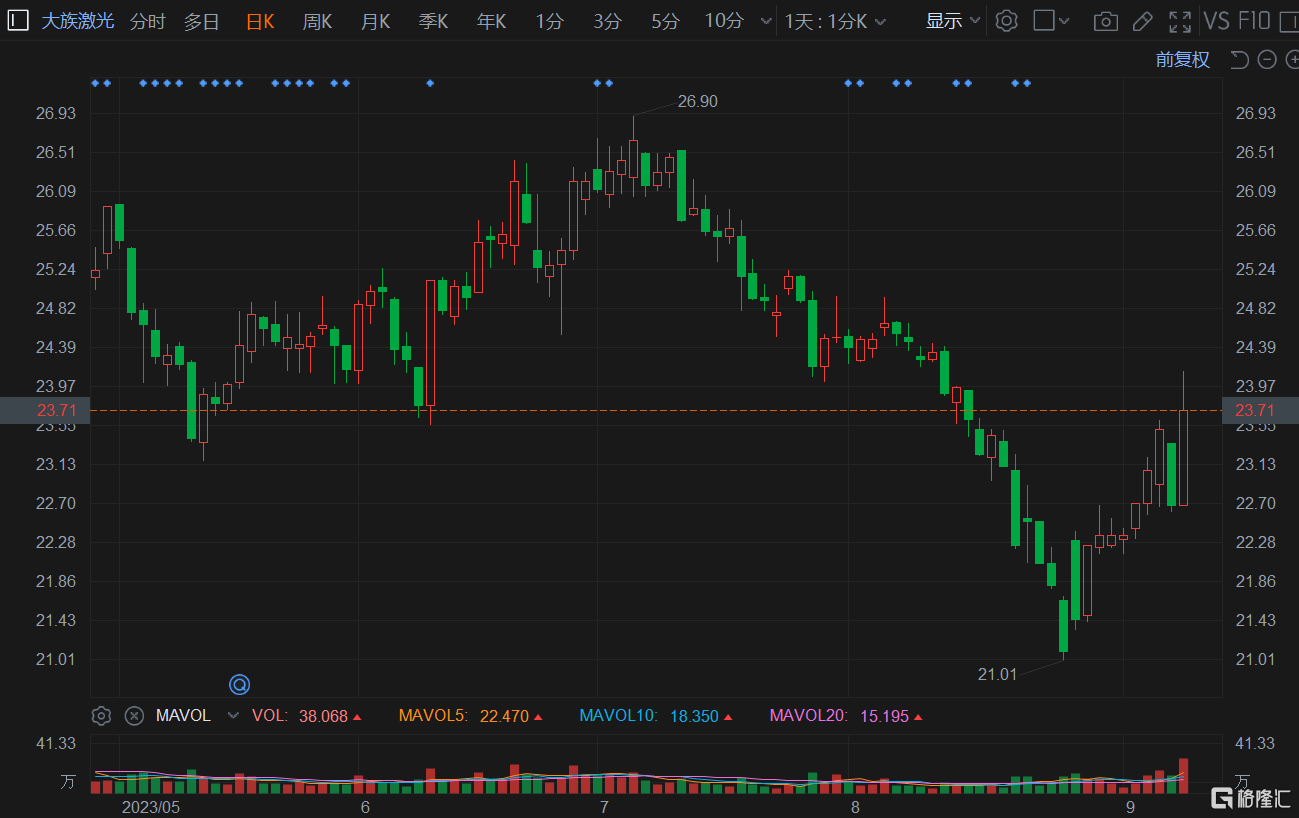 大族激光(002008.SZ)盘中涨超6%,近日自底部反弹近15%,现报23.71元,总市值250亿元。消息上,公司称半导体晶圆切割相关设备主要产品为激光表切、全切设备,激光内部改质切割设备以及刀轮切割设备等,已进入行业头部客户供应链。此外,华为是公司在消费电子业务领域的客户之一。