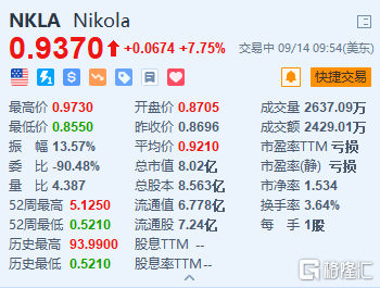 Nikola(NKLA.US)涨7.75%,报0.937美元。Nikola首席执行官说,现在正准备交付氢燃料电池卡车或FCEV(做燃料动力汽车),此前召回电动卡车不会影响FCEV的生产或交付,因为它们使用的是来自不同供应商的不同电池组。