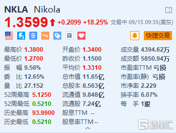 Nikola(NKLA.US)续涨17.83%,报1.35美元。该股周四大涨超32%,收报1.15美元。Nikola首席执行官称,计划在9月底和10月初向经销商交付氢燃料电池电动卡车。两周前,第一批卡车下线,迄今为止,Nikola已收到包括大型车队运营商在内的客户的210多辆燃料电池卡车订单。