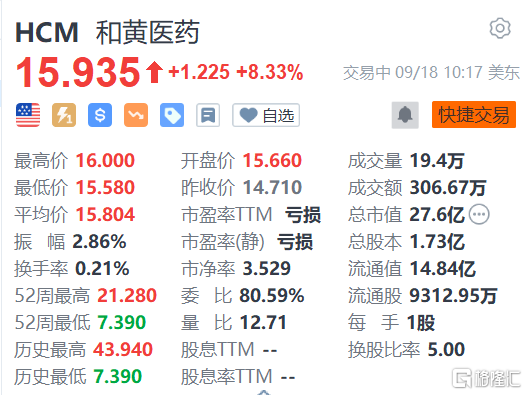 和黄医药(HCM.US)涨超8%,报15.935美元。和黄医药日前完成他泽司他中国桥接研究患者入组。该项桥接研究是一项多中心、开放标签的II期临床试验,旨在评估他泽司他用于治疗复发/难治性滤泡性淋巴瘤患者的疗效、安全性和药代动力学。另外,在8月底,公司赛沃替尼在中国获纳入突破性治疗品种用于治疗胃癌。