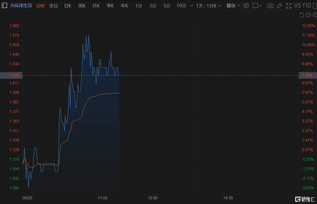 JS环球生活(1691.HK)拉升涨超7%,近6日累涨近45%,现报1.42港元,总市值49.4亿港元。
