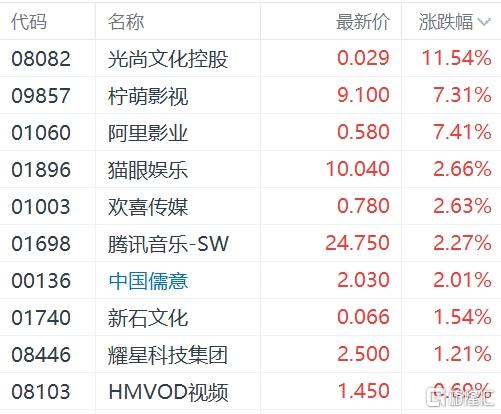 港股市场影视娱乐股集体上涨,其中,柠萌影视和阿里影业涨超7%,猫眼娱乐、欢喜传媒、腾讯音乐和中国儒意涨超2%。根据国家电影局统计,2023年国庆档(9月29日至10月6日)电影总票房为27.34亿元,同比增长超80%。