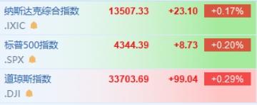 美股三大指数小幅高开,纳指涨0.17%,标普500指数涨0.2%,道指张0.29%。