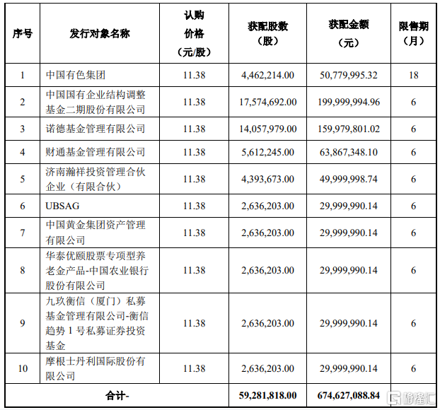 格隆汇10月11日丨东方钽业(000962.SZ)公布向特定对象发行股票发行情况报告书,本次发行价格为11.38元/股,本次向特定对象发行股票的数量为5928.1818万股,本次发行的募集资金总额约为6.75亿元。本次发行对象最终确定为10家,本次配售情况如下: