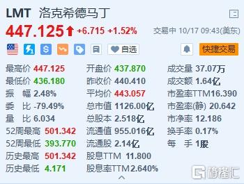 洛克希德马丁(LMT.US)涨1.52%,报447.125美元。公司Q3净销售额168.8亿美元,市场预估167.6亿美元;调整后每股收益6.77美元,市场预估6.67美元。截至季度末,自由现金流达25亿美元,高于市场预期的17亿美元。