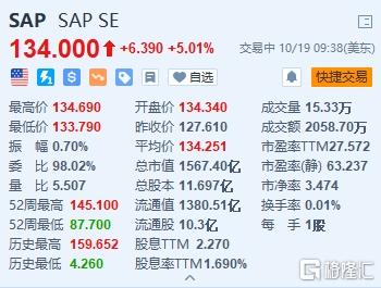 欧洲最大的软件公司SAP(SAP.US)涨超5%,报134美元。SAP第三季度营收77.4亿欧元,同比增长4%;营业利润17.2亿欧元,同比增长11%。SAP重申了2023年指引,并指出其业务具有“弹性”;剔除某些项目后,预计今年营业利润将达到86.5亿至89.5亿欧元,市场预期为85.5亿欧元。