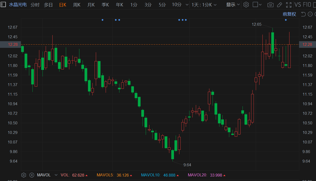 水晶光电(002273.SZ)盘中拉升涨约7%,最高报12.56元逼近阶段高价,总市值171亿元。公司上周五晚间公告,前三季度净利润4.38亿元,同比下降8.81%,其中Q3归母净利润2.6亿元,同比增长11%。东吴证券点评称,Q3单季营收与净利润均稳步提升;Q2营收小幅承压后,Q3单季度业绩逆势拉涨,业绩略超预期。