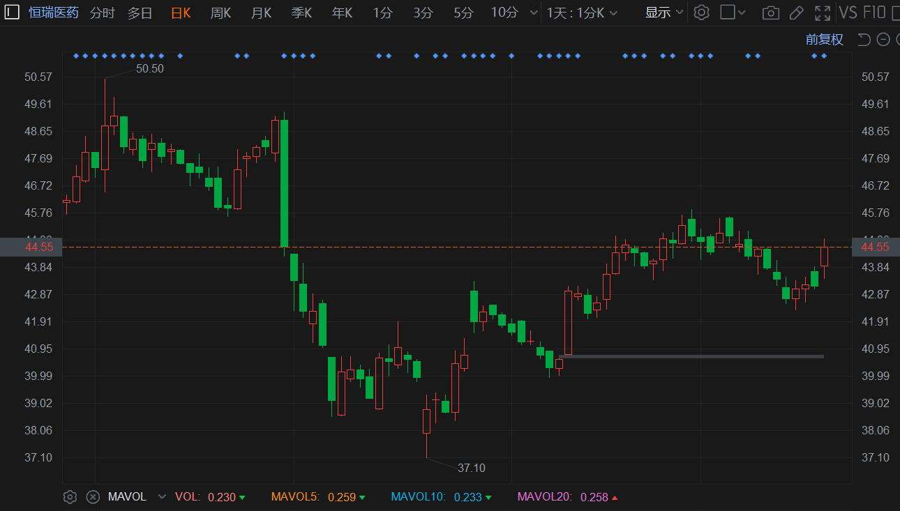 恒瑞医药(600276.SH)冲高涨约4%,现报44.55元,暂成交10.3亿元,总市值2842亿元。公司昨晚公告,前三季度营收170.14亿元,同比增长6.7%,归母净利润34.74亿元,同比增长9.47%。其中,第三季度净利润增速高于上半年引发市场关注,Q3归母净利润11.66亿元,同比增长10.57%。今年以来,恒瑞医药加速创新药的海外授权,借此拓展海外市场。目前已完成四单海外BD(商业拓展)业务。
