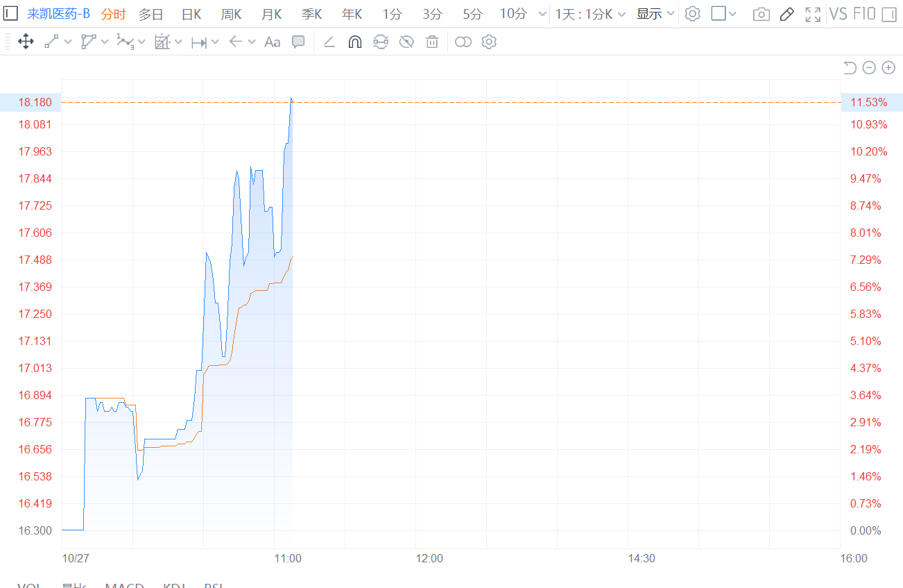 来凯医药(2105.HK)高开高走大涨超11%至18.18港元,市值71亿港元。在近日举行的2023年欧洲肿瘤内科学会(ESMO)年会前列腺癌专场上,来凯医药公布了公司潜在创新药物——LAE001联合afuresertib(LAE002)加泼尼松的治疗前列腺癌I/II期临床研究数据。该联合疗法在治疗mCRPC 患者中展现出积极的抗肿瘤活性和安全性。在40名曾接受1-3线标准治疗后进展(包括至少一线二代抗雄激素药物)的mCRPC患者中,LAE001+afuresertib联合疗法的中位rPFS达7.9个月,比目前文献报道使用标准治疗的mCRPC患者中位rPFS的2-4月有了较大的改善,临床数据令人鼓舞。研究者认为,该方案对耐药性mCRPC具有潜在的临床益处,支持进入III期关键临床研究。