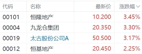 九龙仓集团、恒隆地产、太古A涨超3%,恒基地产涨超2%,新鸿基地产、长实集团、新世界发展涨超1%。李家超10月25日宣读《施政报告》公布3项楼市减辣措施:将买家印花税及第二套房印花税的税率减半至7.5%;将SSD年期缩短至两年;以及专才/人才计划下的非港人置业印花税实施“先免后征”。