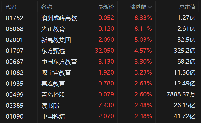 A股AI教育概念强势,带动港股教育股多数上涨,其中澳洲成峰高教(1752.HK)涨8.33%表现最佳,光正教育、新高教集团、中国东方教育等跟涨。