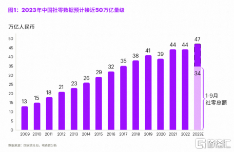 埃森哲认为,随着消费回暖,消费潜力不断释放,未来中国消费市场前景可观。根据报告测算,今年1-9月中国社会消费品零售总额达34亿,如果第四季度社零占比与去年持平,2023年全年社零将达到47万亿。