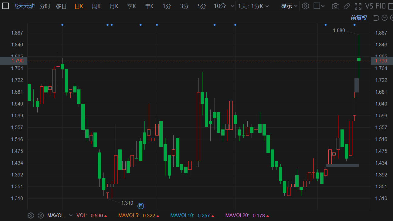 飞天云动(6610.HK)盘中拉升涨超12%,3日连涨超25%,最高报1.88港元刷新阶段高价,总市值32.4亿港元。消息上,公司拟适时回购最多7000万港元的股份,此举显示公司对集团长期增长的信心。另外,南向资金昨日净买入飞天云动167.40万股,并录得连续3日增持。
