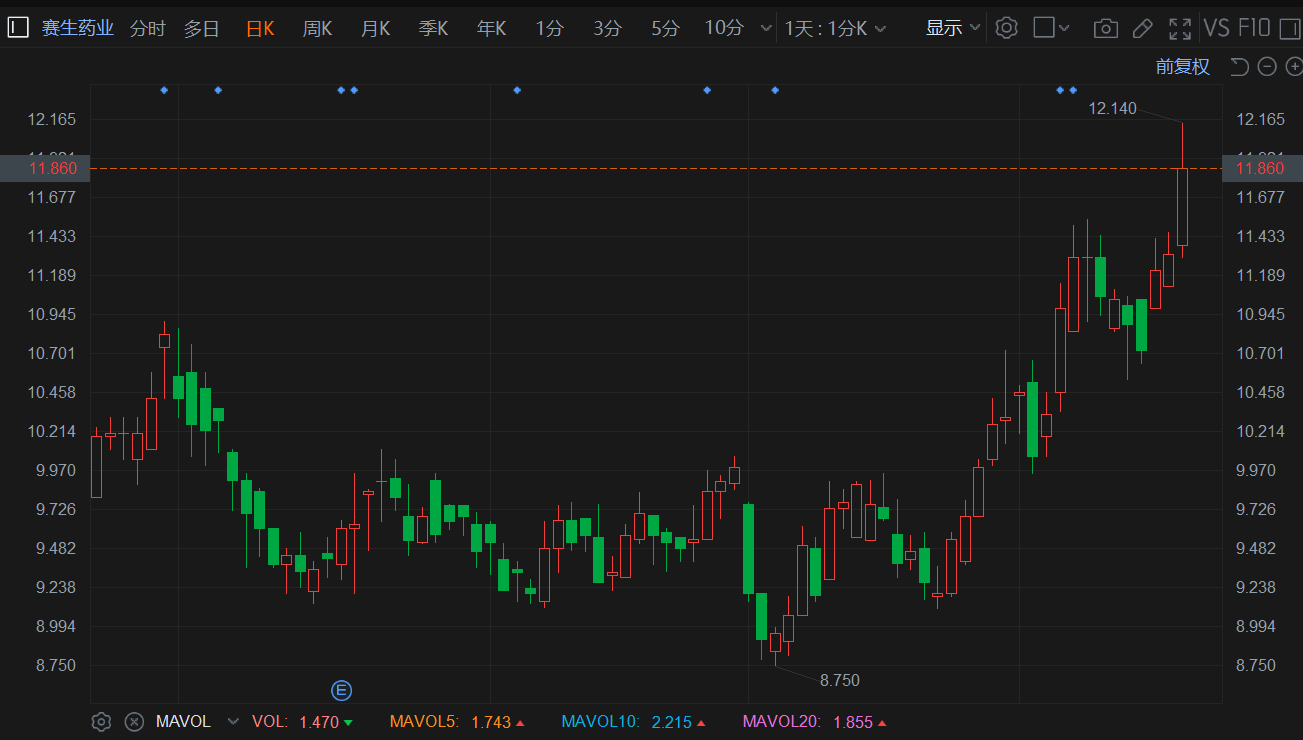 赛生药业(6600.HK)盘中快速拉升涨超6%,最高报12.14港元续刷阶段高价,总市值73亿港元。消息面上,今年以来赛生药业已多次斥资回购,11月又传出引进乳腺癌新药在中国的独家开发及商业化权益的消息。据悉,在上半年赛生药业在日达仙上的销售收入同比增长13.1%达到13.34亿元,占总销售收入超八成。
