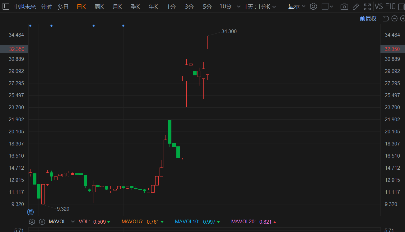 中旭未来(9890.HK)午后一度大涨超16%,最高报34.3港元创上市新高价,月内累计升幅更是高达170%,最新总市值175亿港元。