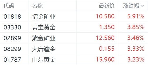 金价大涨,港股市场黄金股集体高开,招金矿业涨近6%,灵宝黄金、紫金矿业、大唐潼金和山东黄金涨超3%。现货黄金今日盘中一度涨至2146.87美元/盎司,再创历史新高。分析师表示,市场对未来美联储降息的前景正在刺激投资者大举买入黄金,目前投资人押注明年初美联储将会降息。