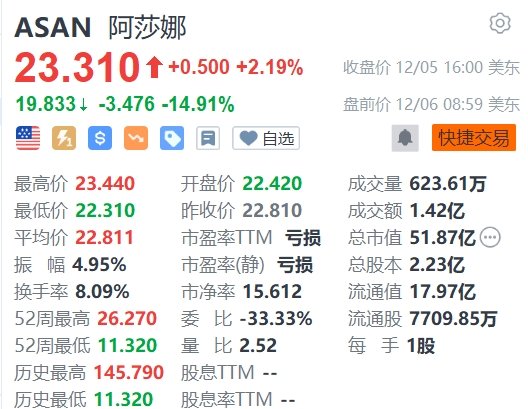 阿莎娜(ASAN.US)美股盘前大跌近15%,报19.833美元。阿莎娜2023年Q3财报实现营收1.665亿美元,前值为1.414亿美元,预期值为1.641亿美元;每股收益为-0.04美元,前值为-0.26美元,预期值为-0.11美元。