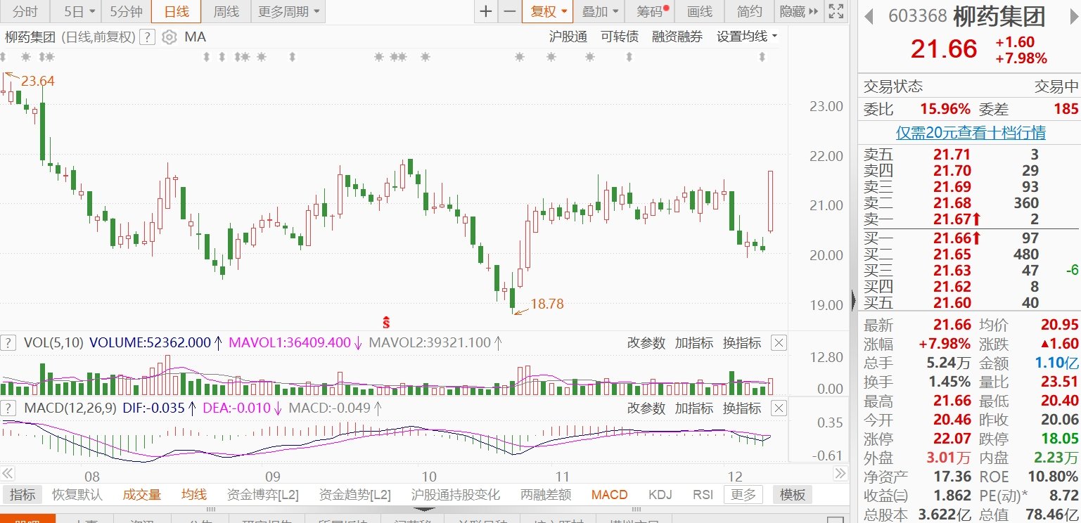 柳药集团(603368.SH)涨近8%,报21.66元,总市值78.46亿元。柳药集团公告,近日收到中国证监会出具的《关于同意广西柳药集团股份有限公司向特定对象发行股票注册的批复》。公司计划向不超过35名符合中国证监会规定条件的特定对象,发行股票的数量不超过108,668,493股(含本数),募集资金总额不超过10亿元,将用于医院器械耗材SPD项目、健康产业园项目之中药配方颗粒生产及配套增值服务项目(一期)、柳州物流运营中心项目、信息化建设项目、补充营运资金。