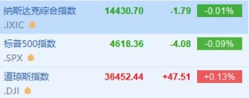 美股三大指数涨跌互现,纳指跌0.01%,标普500指数跌0.09%,道指涨0.13%。