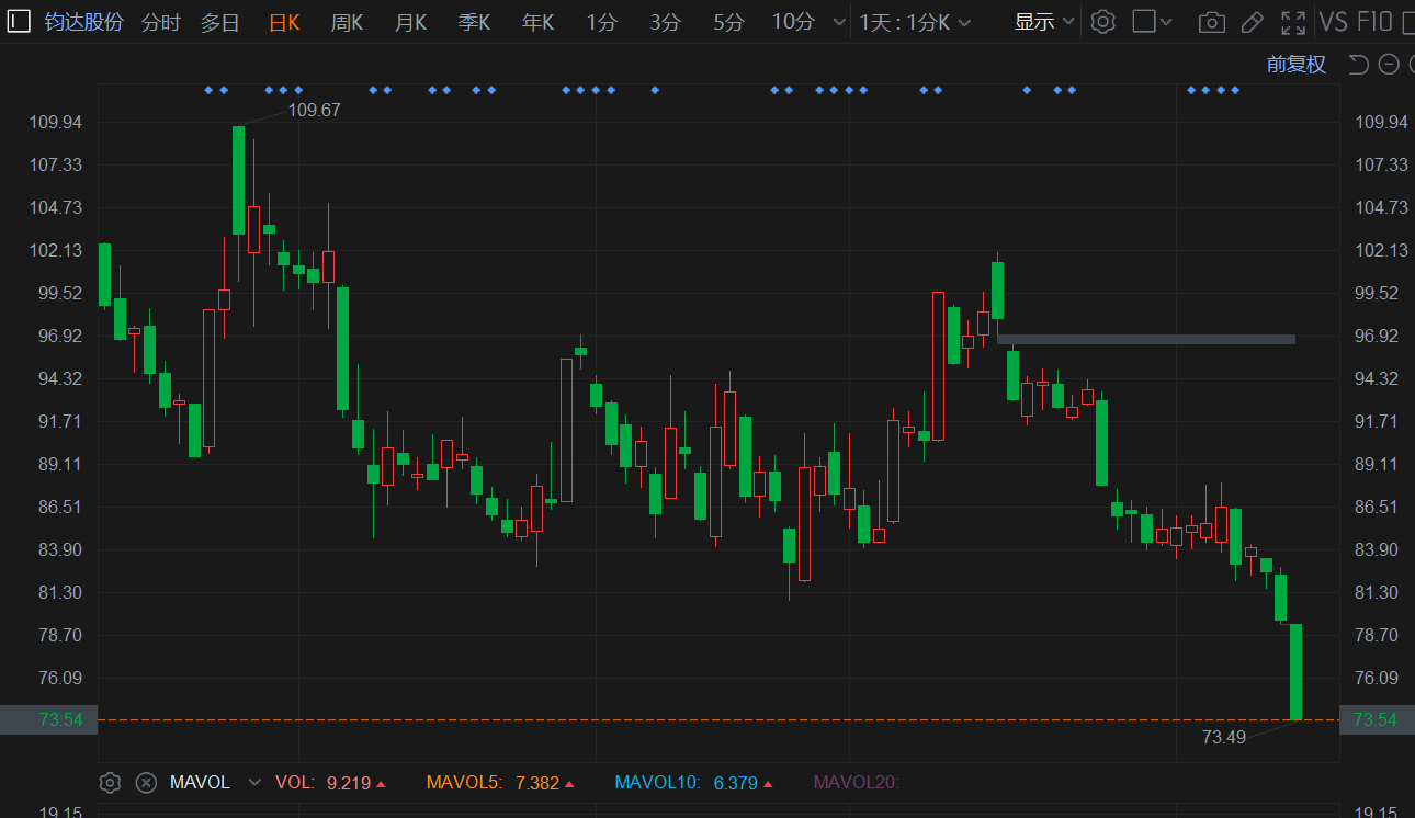 钧达股份(002865.SZ)跌幅扩大至7.6%,报73.49元创年内低价,总市值167亿元。消息上,昨日遭北上资金卖出2271.98万元。日前公司在互动平台回应股价暴跌时称,二级市场股价受宏观环境、投资者情绪等多重因素影响,短期股价的波动是正常现象。