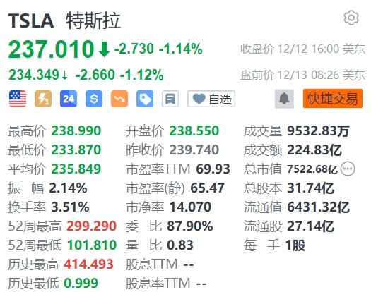 继昨日收盘跌逾1%,特斯拉(TSLA.US)今日美股盘前续跌1.12%,报234.349美元。消息上,特斯拉因自动驾驶问题召回2,031,220辆车辆,包括2012-2023年款Model