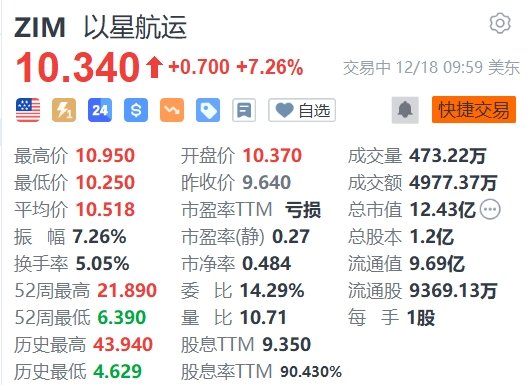 以星航运(ZIM.US)涨超7%,报10.34美元。消息上,近日,红海-曼德海峡已有商船遭遇袭击,全球最大的航运集团地中海航运公司和第三大航运公司法国达飞轮船周六宣布,暂停其船只的红海航线。分析师预计,短期内运价都会飙升,而更高的运输成本最终将打击消费者。