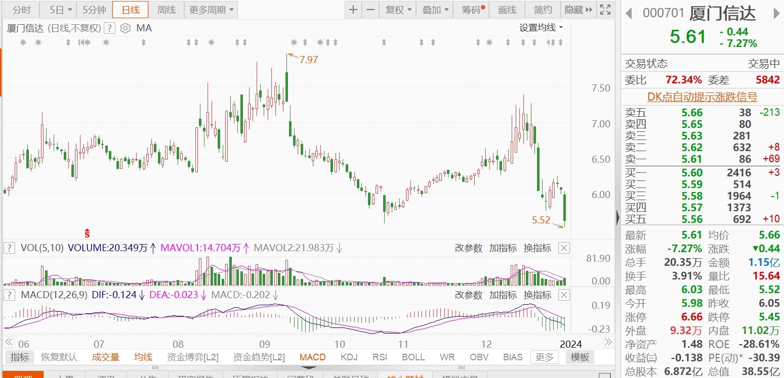 厦门信达(000701.SZ)跌逾7%,报5.61元,创2022年11月以来新低,总市值38.55亿元。1月3日,厦门信达发布向特定对象发行股票解除限售上市流通的提示性公告,公司本次解除限售股份为公司2022年度向特定对象发行的股票,拟解除限售的股份数量为109,209,422股,占公司总股本的15.89%;本次解除限售的股份可上市流通日期为2024年1月4日。