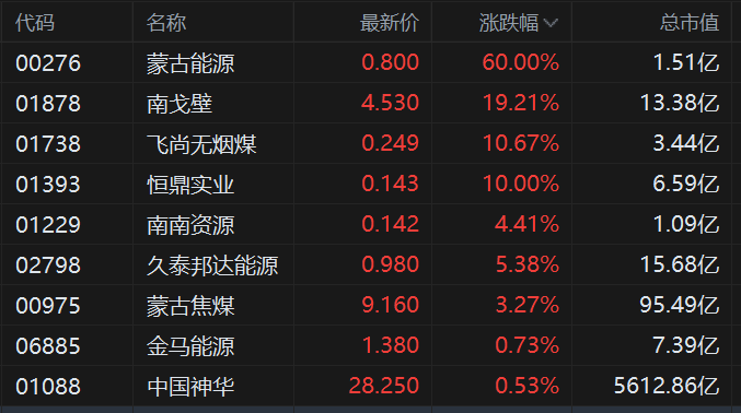 细价股蒙古能源飙涨60%领衔上涨,南戈壁继续大涨逾19%续刷阶段新高,蒙古焦煤、中国神华等多数上涨。