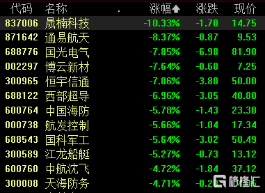 国防军工板块跌幅居前,博云新材、恒宇信通跌超7%,西部超导、中国海防、中航沈飞等大幅走低。