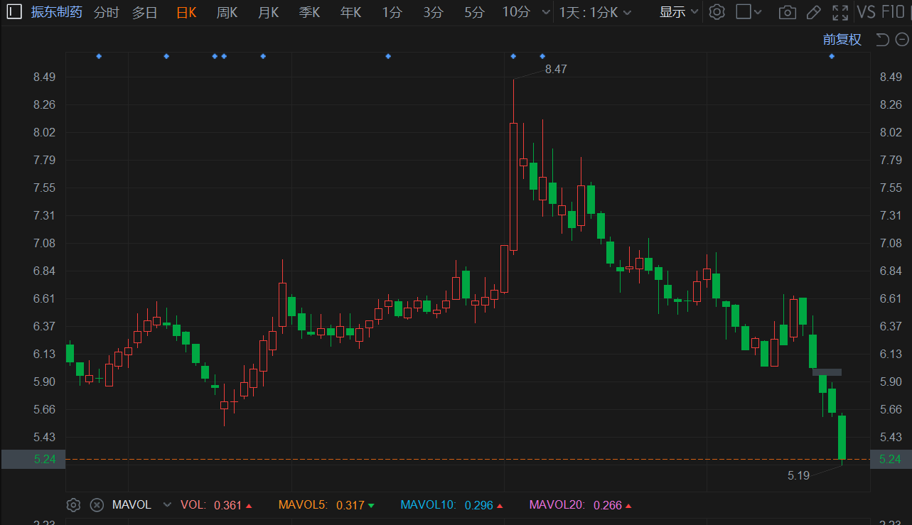 振东制药(300158.SZ)继续下跌超7%,5日连跌超20%,现报5.24元创阶段新低,总市值54亿元。公司预计2023年归属于上市公司股东的净亏损3000万元―4000万元,比上年同期减亏22.01%-41.51%。报告期内,受医保控费、国家集采等行业政策影响,公司部分产品销量和价格下滑。