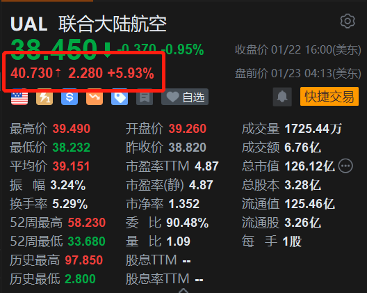 联合大陆航空(UAL.US)盘前涨5.93%,报40.73美元。消息上,公司23年Q4产能相比去年同期增长了14.7%;总营收136亿美元,相比去年同期增长了9.9%,超过了华尔街预估的135.4亿美元。
