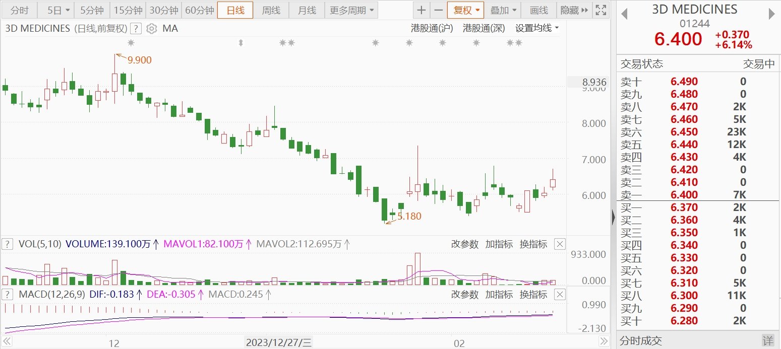 3D MEDICINES(1244.HK)今日盘初一度涨近10%,现涨6.14%报6.4港元,总市值16.53亿港元。消息面上,该公司于2024年2月14日斥资5.85万港元回购1万股,回购价为每股5.85港元。于2024年1月31日斥资5.83万港元回购股份1万股,回购价为每股5.83港元。