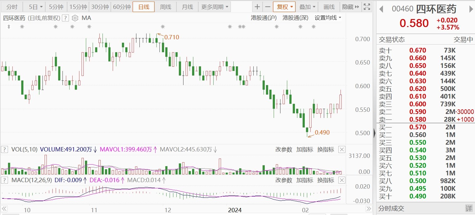 四环医药(0460.HK)一度涨超5%,现涨3.57%报0.58港元,总市值54.11亿港元。华金证券研报指出,1)短期:医药行业短期超跌,有望迎来阶段性反弹。反弹角度建议配置前期跌幅较大的板块个股。2023年年报业绩预告披露完毕,中药血制品等板块业绩稳健,估值合理。2)长期:当前行业处于筑底阶段,无论从估值角度、涨跌幅角度等都处于低位。行业基本面需求端稳定向好,行业生态不断优化。