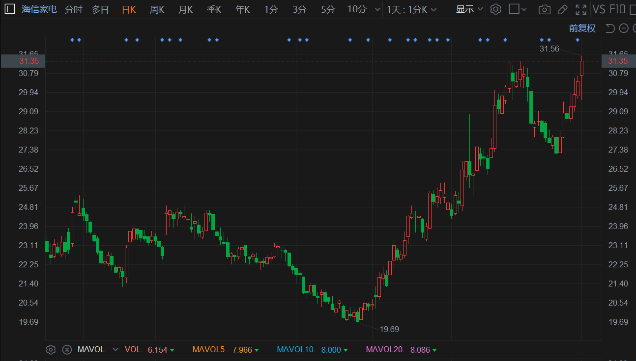海信家电(000921.SZ)午间收涨3%,盘中高见31.56元续创历史新高,总市值超435亿元。公司23年实现营业收入856亿元,同比增长15.50%,实现归母净利润28.37亿元,同比增长97.73%。营收净利润同比双双增长,盈利能力上升。该数据高于大多数分析师的预期,此前分析师普遍预期2023年净利润为盈利28.08亿元左右。