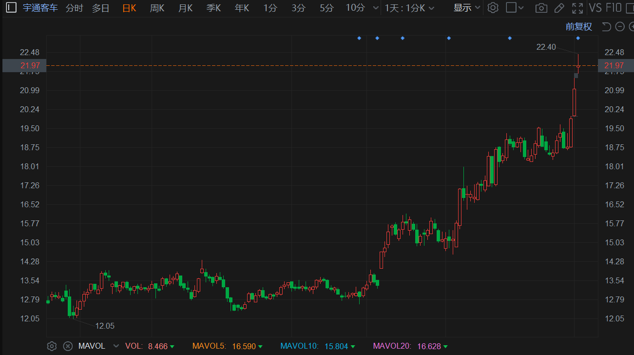 宇通客车(600066.SH)盘初涨超6%,高见22.4元逼近历史高位,近4日连涨近20%,市值超480亿元。公司昨晚公告,2023年收入270.42亿元,同比增长24.05%;净利润18.17亿元,同比增长139.36%,拟每10股派发现金红利15元(含税)。2023年宇通客车实现客车销售量为36518辆,同比增长20.93%,公司预计今年海内外市场将进一步释放增量。